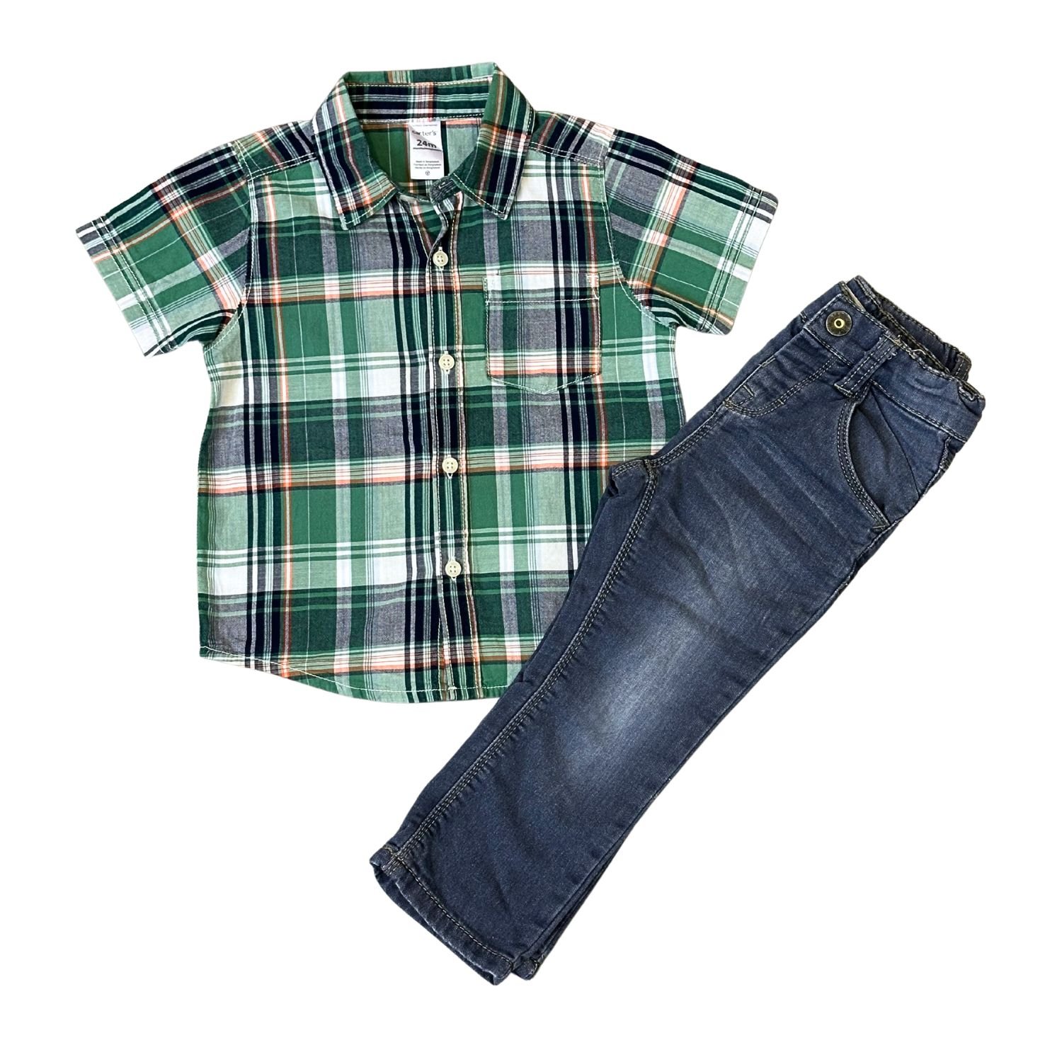 Combinación smart para pequeños caballeros. Camisa verde y jean gris con mucho estilo.• Marcas: Carter’s / Name It• Estado: Como Nuevo (Grado A+)• Talle: 92 cm (18-24 Meses)