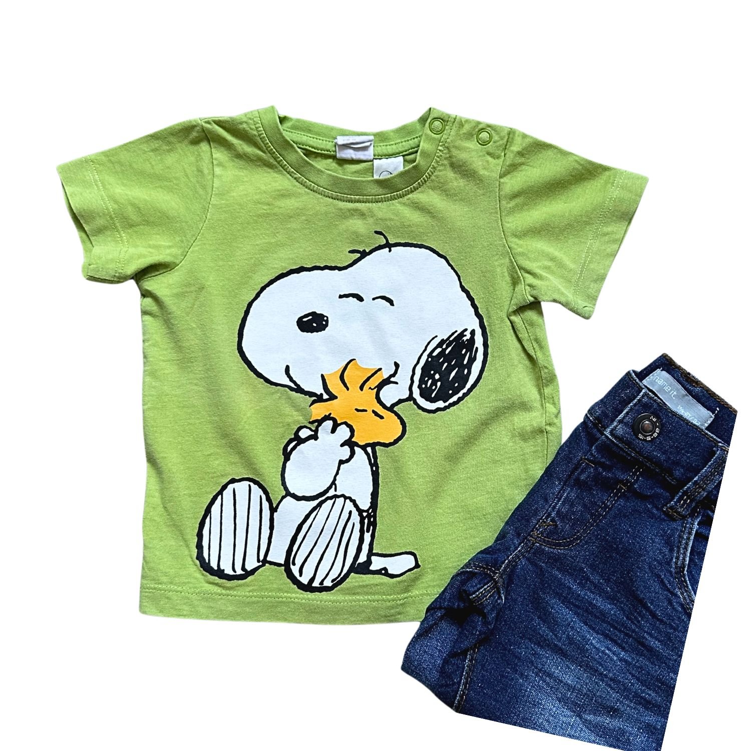 Amistad animada. Remera verde con el adorable Snoopy.• Personaje: Snoopy (Peanuts)• Estado: Seminuevo (Grado A)• Talle: 74 cm (6-9 Meses)