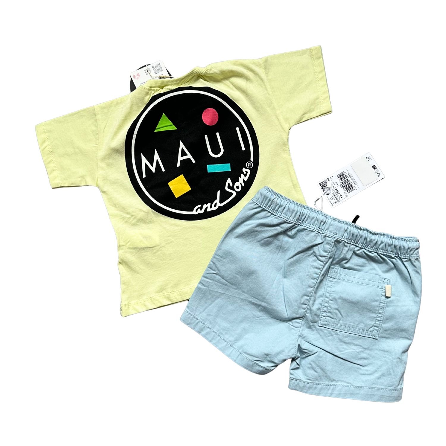 Hemos unido a Mango y Zara para crear este look veraniego irresistible. Una bermuda estilosa combinada con una remera amarilla llena de energía. Todo el conjunto es nuevo, listo para las vacaciones de tu pequeño.